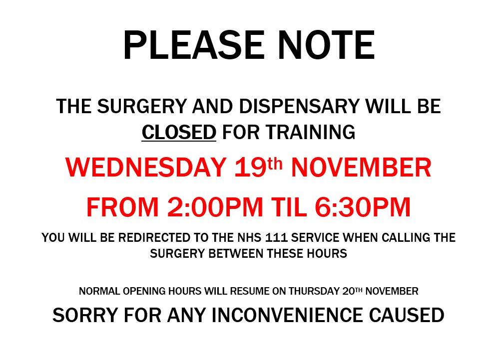 Please note: The Surgery and Dispensary will be closed for training on Wednesday 19th November from 2:00pm til 6:30pm. You will be redirected to the NHS 111 Service when calling the Surgery between these hours. Normal opening hours will resume on Thursday 20th November. Sorry for any inconvenience caused.